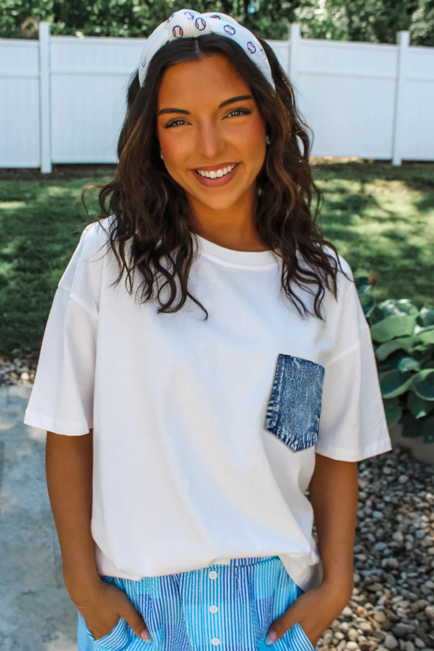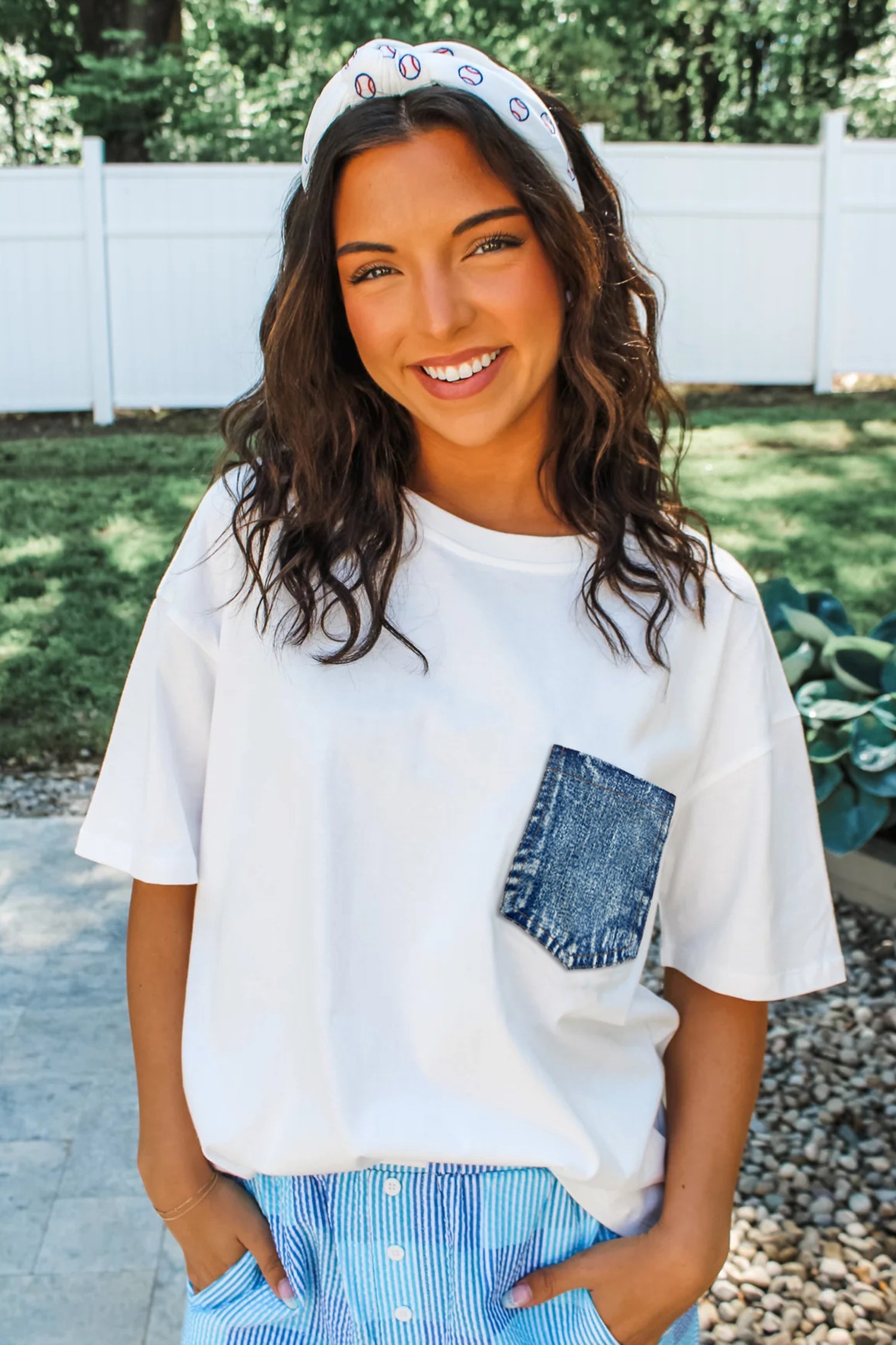White Color Block Chest Pocket Patched Casual Short Sleeve Top